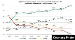 С 2011 года основной прирост новых генерирующих мощностей в ЕС осуществляется за счет строительства объектов ВИЭ, соответственно значительно снижаются объемы строительства традиционных газовых и угольных электростанций. По итогам 2018 года более 95% (19,6 ГВт из 20,6 ГВт) новых мощностей в ЕС обеспечены за счет объектов ВИЭ. Важно отметить, что такая динамика сохраняется и даже растет все последние 8 лет и непременно сохраниться в обозримом будущем, ведь на сегодняшний день в ЕС уже определяются целевые даты по декарбонизации не только сферы электроэнергетики, но и всей энергосистемы (ТЭК).