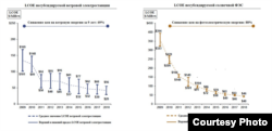 Вышеуказанные диаграммы международно-признанной консалтинговой компании Lazard (Швейцария), ежегодно публикующей доклады по LCOE, наглядно показывают, что за последние 9 лет стоимость электроэнергия солнечных и ветровых станций снизилась на 88% и 69% соответственно.