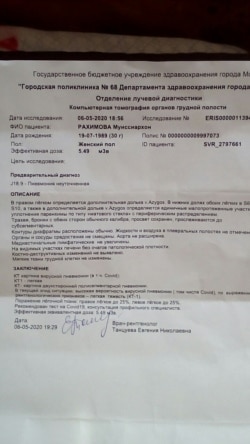 Рахимова отправила в редакцию «Озодлика» результаты анализов, предоставленные московскими медиками. Ей поставили диагноз «пневмония неуточненная»​.