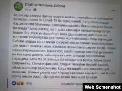 «В отделении, в котором мы лечимся, работает один врач и одна медсестра. Они ответственны за все пять этажей, где лежат пациенты с коронавирусом. Когда я поинтересовалась, почему их только двое на все отделение, они сказали мне: «Многие врачи и медсестры отказались выйти на работу, так как с них взяли расписки, в которых они обязуются винить только себя в случае заражения коронавирусной инфекцией», – написала пользовательница Facebook'а @Dilafruz Yunusova Zoirova.